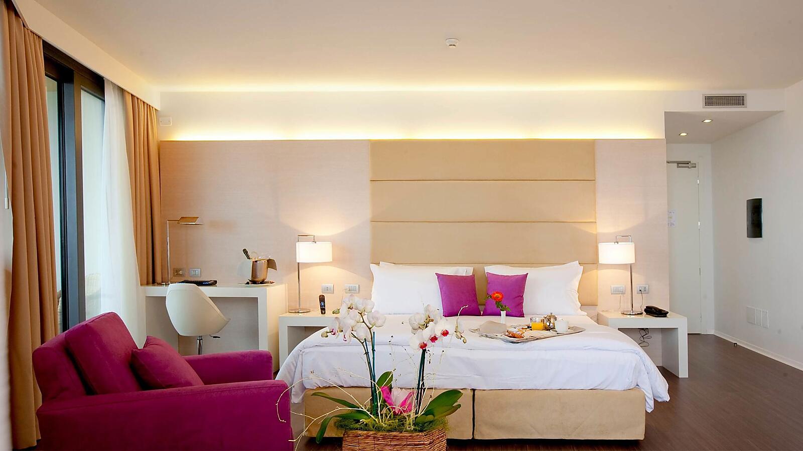 Jedes Zimmer ist mit kostenlosem WLAN, Satellitenfernsehen, einem Wasserkocher mit einer Auswahl an Tee und Kräutertees, einem Safe, einer Minibar und Klimaanlage ausgestattet. Das Bad bietet Pflegeprodukte, ein Spa-Set mit Bademantel, Handtuch und Pantoffeln, einen Haartrockner und eine geräumige Dusche. Der möblierte Balkon bietet einen seitlichen Meerblick.