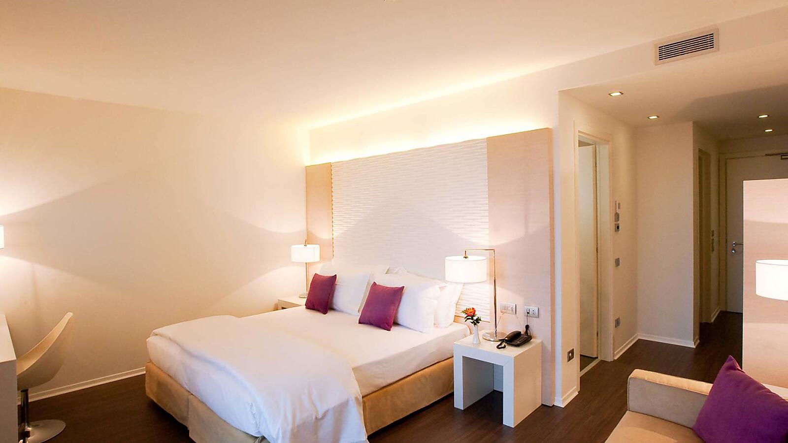 Sie sind hell und geräumig (ca. 31 m²), harmonisch eingerichtet mit modernen Möbeln und stilvollen Details: Die Superior Zimmer bieten eine bequeme und angenehme Unterkunft, ideal für bis zu drei Personen. Jedes Zimmer ist ausgestattet mit einem großen Doppelbett, einem Einzel-Schlafsofa, einem Schreibtisch, einem begehbaren Kleiderschrank und einem möblierten Balkon. Die Möbel und Accessoires sind in hellen Farben gehalten, während Lampen und Lichtakzente ein Gefühl von Wärme und Wohlbefinden vermitteln.