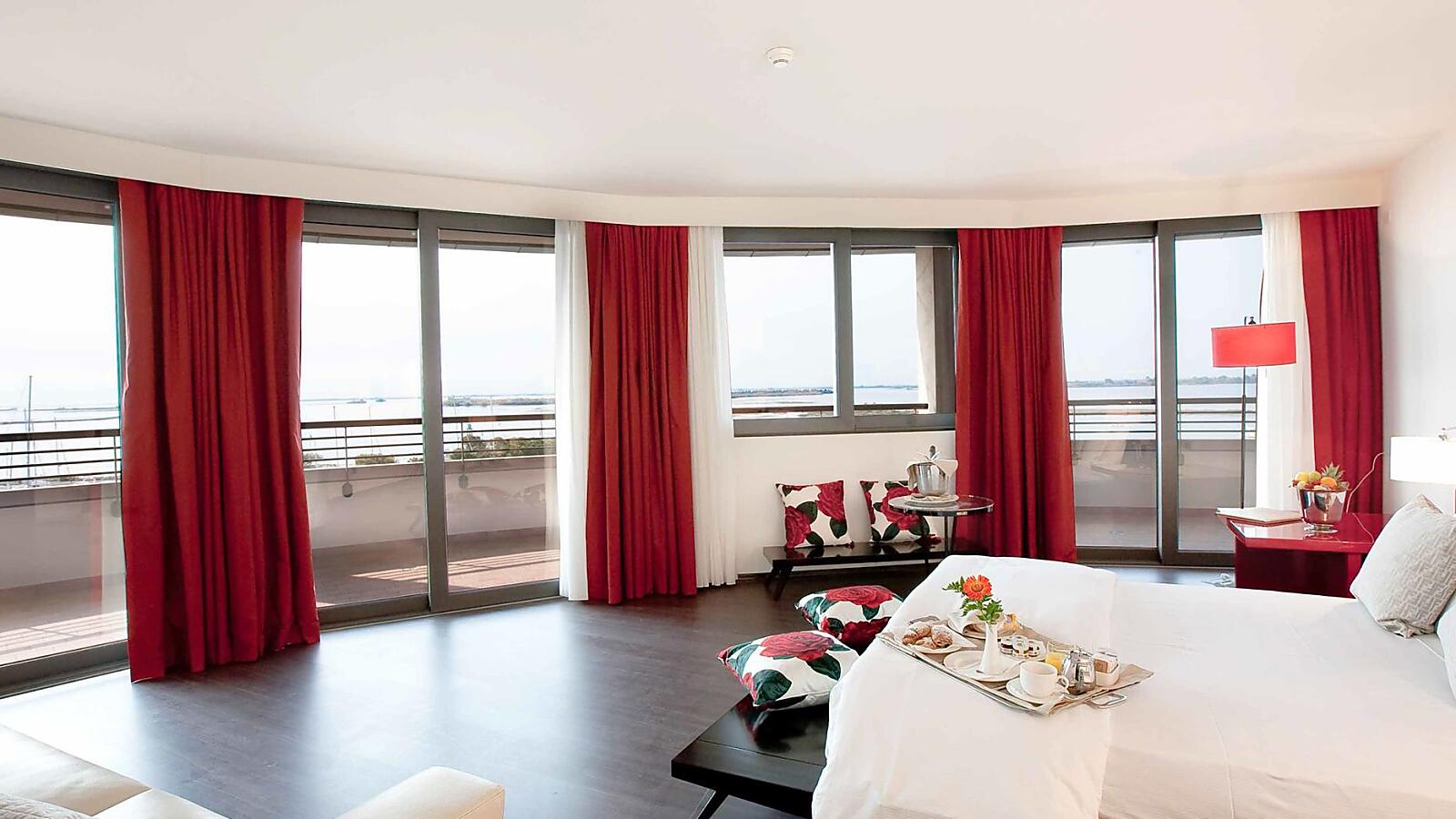 Mit einer Fläche von etwa 45 m² verfügen sie über ein King-Size-Doppelbett, eine Sitzecke, einen begehbaren Kleiderschrank und eine große Terrasse mit Meerblick. Zu den Annehmlichkeiten gehören kostenloses WLAN, Satellitenfernsehen, eine Kaffeekapselmaschine, ein Wasserkocher mit einer Auswahl an Tee und Kräutertees, Klimaanlage, ein Safe, eine Minibar und ein Spa-Set mit Bademantel und Pantoffeln. Das Badezimmer ist mit zwei Waschbecken, einer extragroßen Dusche, einem Haartrockner und einem Vanity-Set ausgestattet.