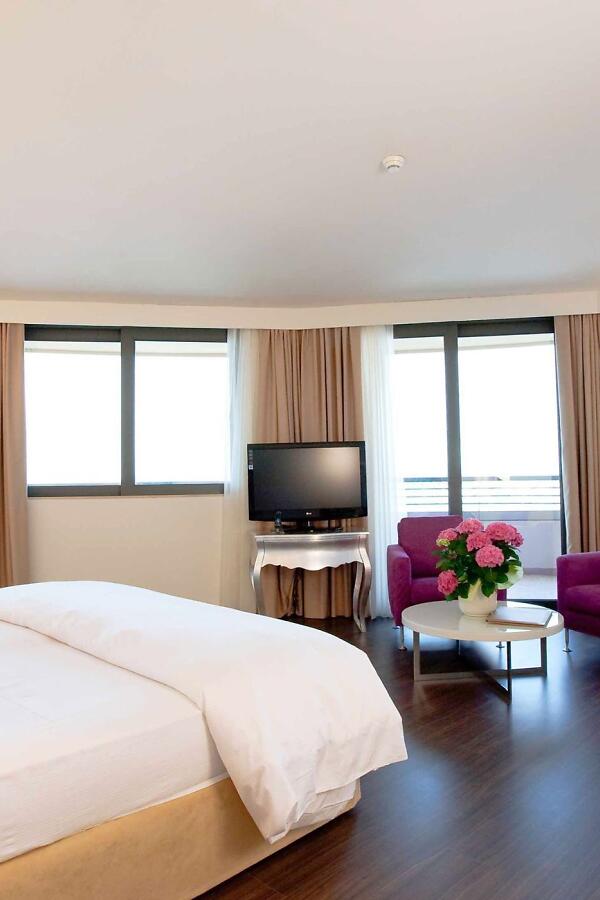 Airy and comfortable, the Junior Suites are harmoniously designed with light tones and vibrant accents. Generously sized at approximately 45 to 48 m², they comfortably accommodate a family of four. Each suite features a king-size double bed, a sofa bed, a walk-in closet, a cozy seating area, and a spacious semi-circular furnished terrace measuring 26 m².