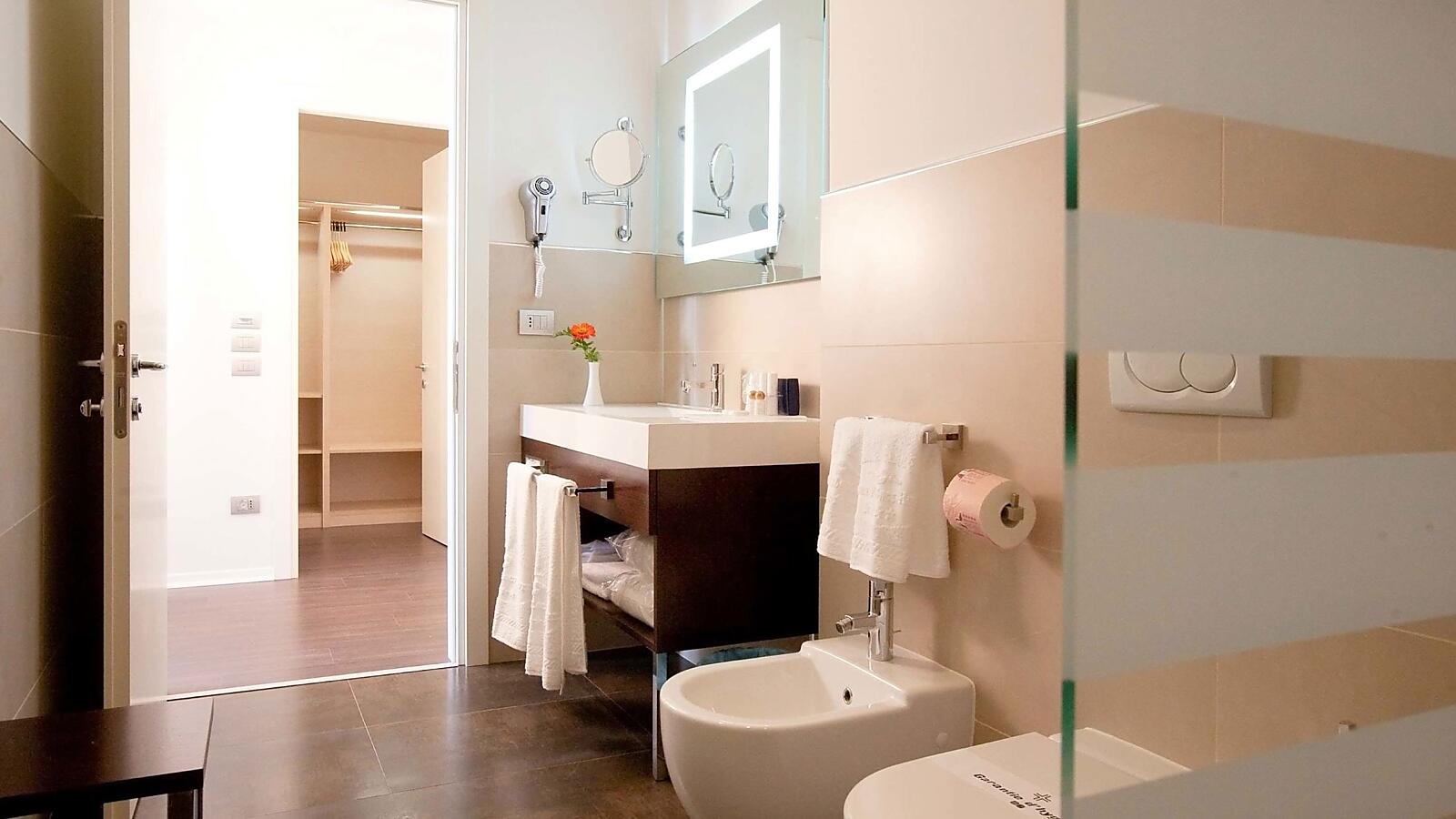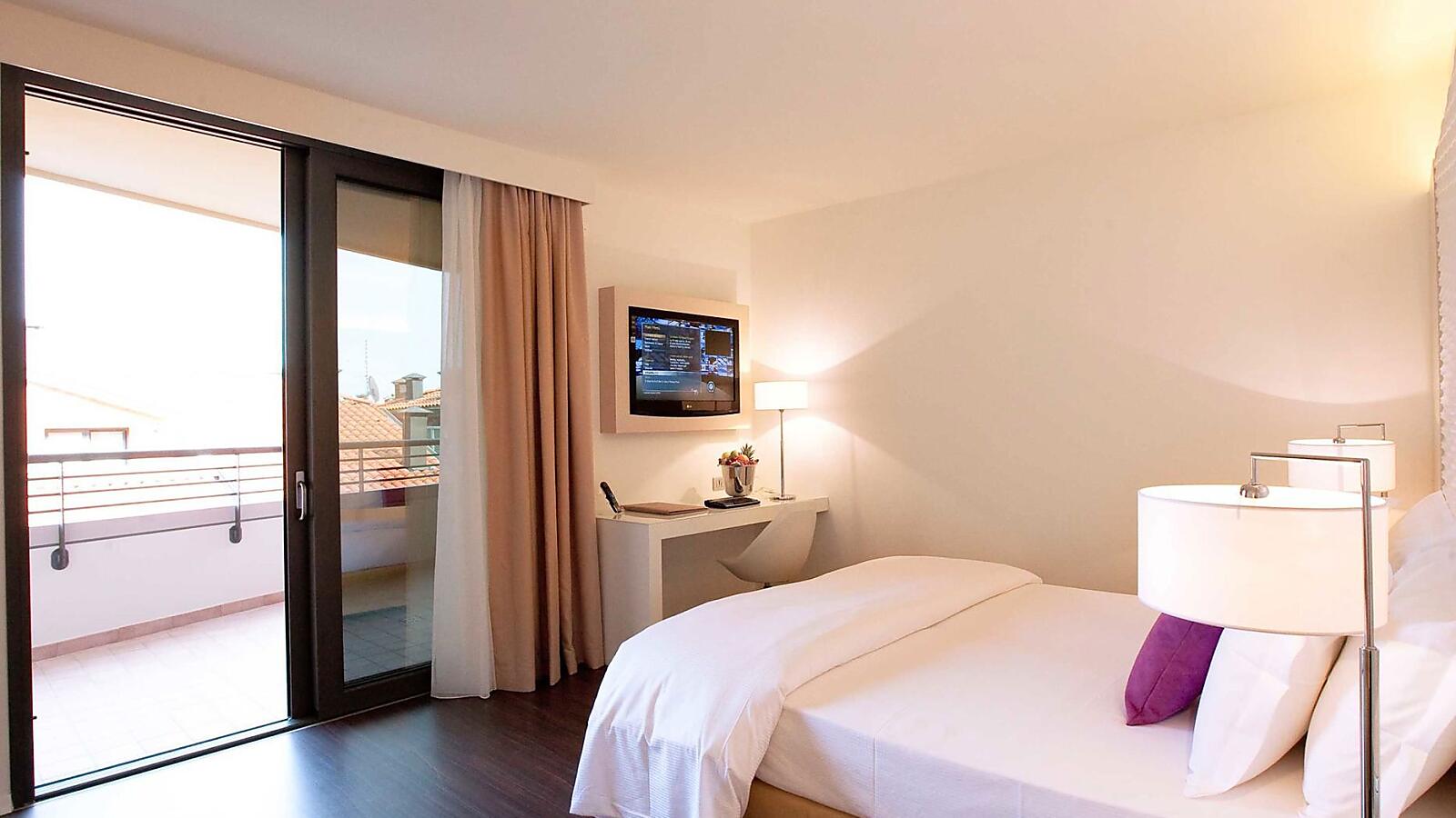 Tra le dotazioni wi-fi gratuito, TV con canali satellitari, bollitore con selezione di tè e tisane, cassaforte, frigobar, aria condizionata, kit spa con accappatoio, telo e ciabattine. Il bagno, molto spazioso, offre set di cortesia asciugacapelli e box doccia. Per godere di un panorama ancora più suggestivo, è possibile optare per una camera con vista mare laterale o una delle nostre superior con una vista mare che spazia dalla laguna al centro storico.